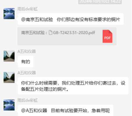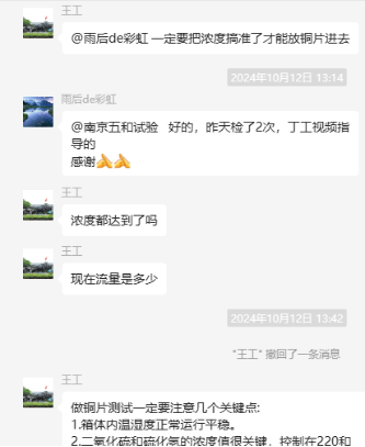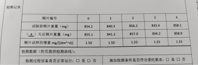 為了更好地說明銅片試驗的重要性,下面分享一個檢測公司的銅片試驗實際案例:2024年8月份合肥******檢測技術(shù)有限公司第一次采購我司一臺型號為“WHQ-300B”型的混合氣體腐蝕試驗箱,設(shè)備被運送到客戶指定的場地安裝調(diào)試運行。安裝調(diào)試后,客戶后期自行進行一次銅片增重試驗,我司技術(shù)人員進行線上指導(dǎo)操作,試驗結(jié)束之后客戶將數(shù)據(jù)發(fā)給我司,以下是客戶和我司聊天記錄以及客戶做的數(shù)據(jù)信息: